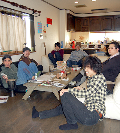 この家、7つの部屋が3フロアに分かれている。「たぶん2世帯住宅用やと思うんですけど。それぞれにプライベートのスペースがあるのが良かった」とは物件を見つけてきた大原哲夫さん(左中)。JR立花駅から徒歩5分ほどにもかかわらず、家賃は一人2万5千円ほど。光熱費を入れても4万円弱だ。スーパーから商店街まで買いものには便利だし、食べたり飲んだりの店も駅前に充実。そもそも7人中2人は立花と阪神尼崎でバーをやっているので遊ぶのには困らな い。「連れ立って銭湯とかコインランドリーに行ったり、朝まで麻雀したあと喫茶店にモーニング食べに行ったり」(中井知之さん・ネットワークエンジニア・左奥)。快適でありつつ、どことなく下町らしさが漂うのがこの街ならではだ。